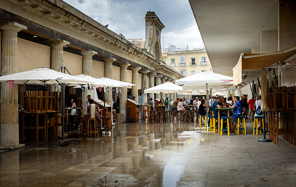 Das "Teatro Romano de Cádiz" stand ebenfalls auf unserem Programm. An einem eher trüberen Tag, für den Regen vorausgesagt worden war, nahmen wir dieses Vorhaben in Angriff. Als wir nur noch ein paar Hundert Meter davon entfernt waren, begann es zu tröpfeln. Wir stellten uns bei einer Bushaltestelle unter, da öffneten sich die Schleusen und ein heftiges Gewitter entlud sich über uns. Nach ein paar Minuten hörte der Regen zwar auf, aber wir beschlossen den Rückzug, auf dem wir noch im "Mercado Central Cádiz" vorbeischauten und die Leute beobachteten, wie sie immer wieder ihren Schirm aufspannten oder unter Dach Schutz vor dem Regen suchten.